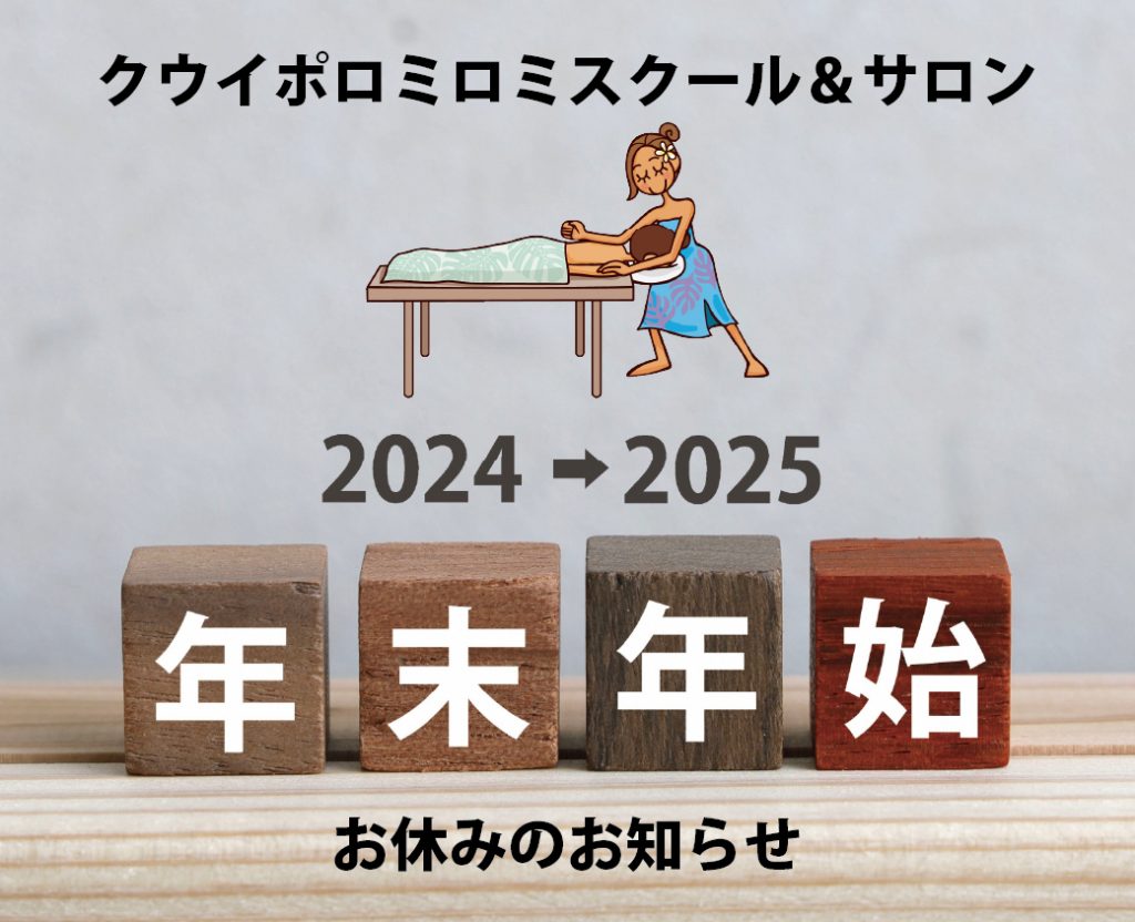 年末年始の営業 2024~2025|クウイポロミロミスクール&サロン 2025/02/16 2024年年末 ・12月30日(月)まで通常営業 ※当日予約もご予約可 年末年始 ・12月31日(火)~1月3日(金) 年末年始のお休み ※LINEメンバーのみ3日も営業可能。LINEでお問合せください。 2025年年始 ・1月4日(木)より通常営業 ※当日予約もご予約可 予約 ■ LINE ※まだLINEメンバーになられていない方は下記画像をクリックしてお友だち追加後トーク(会話)にてご希望をお伝えください。 ■ WEB ※画像をクリックするとLINE予約なしでインターネット予約ができます。