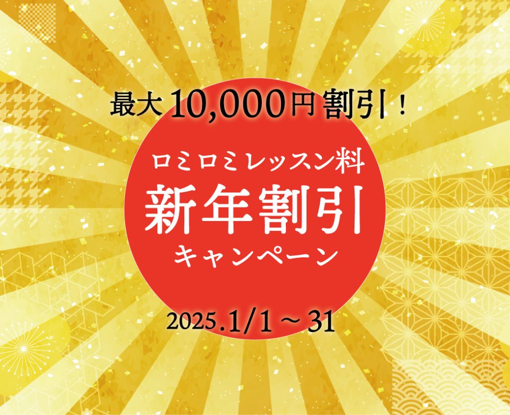 新しい年に、ハワイの伝統的な人を幸せにするお仕事であるハワイアンマッサージ・ロミロミでやりがいのある生活をスタートしたいみなさまのために【ロミロミレッスン料新年割引キャンペーン】を実施します。